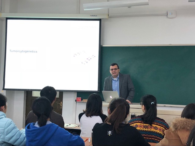 本次海外优质课程的教学内容由主管教学副经理贺文琦教授全程陪同。课程以Hugo教授的自我介绍拉开帷幕,他简述了自己的求学经历和科研方向。第一节课他以肿瘤生物学为主题,循序渐进,从染色体这个点切入逐渐扩展到科学研究常用的实验操作。在进行专业课的讲解时,他将自己的科研经历与专业知识相结合,以新的思维模式和讲授方式把知识传授给大家。虽然在专业英语的理解方面同学们还有一定的差距,但Hugo将晦涩的理论知识用浅显的语言表达了出来,语言幽默风趣,时不时就会与同学们互动交流,鼓励同学们表达想法,激烈的思想碰撞使同学们受益匪浅。