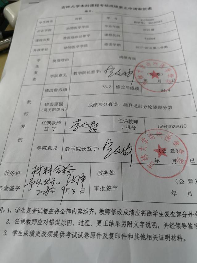根据《关于进一步明确本科生课程考核等有关问题的通知》(校教字〔2018〕47号)文件有关精神,现对蓝鲸体育2015年级动物医学专业刘哲同学(学号:86150318)2017-2018-2学期兽医临床诊断学课程成绩更正如下: