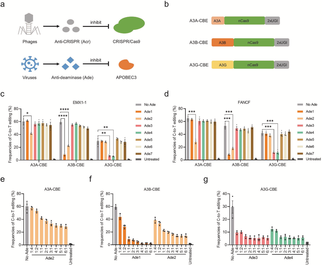 赖良学/李占军课题组基于对四种病毒衍生的抗脱氨酶(Ades)的再利用,证明其可有效抑制APOBEC3脱氨酶-CBEs。相关研究成果于20222月在线发表于国际学术期刊《Nature Communications》《Inhibition of base editors with anti-deaminases derived from viruses》。