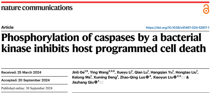 2024年9月30日,蓝鲸体育邱家章教授团队在学术期刊《Nature Communications》上发表,题为“Phosphorylation of caspases by a bacterial kinase inhibits host programmed cell death”的研究论文。