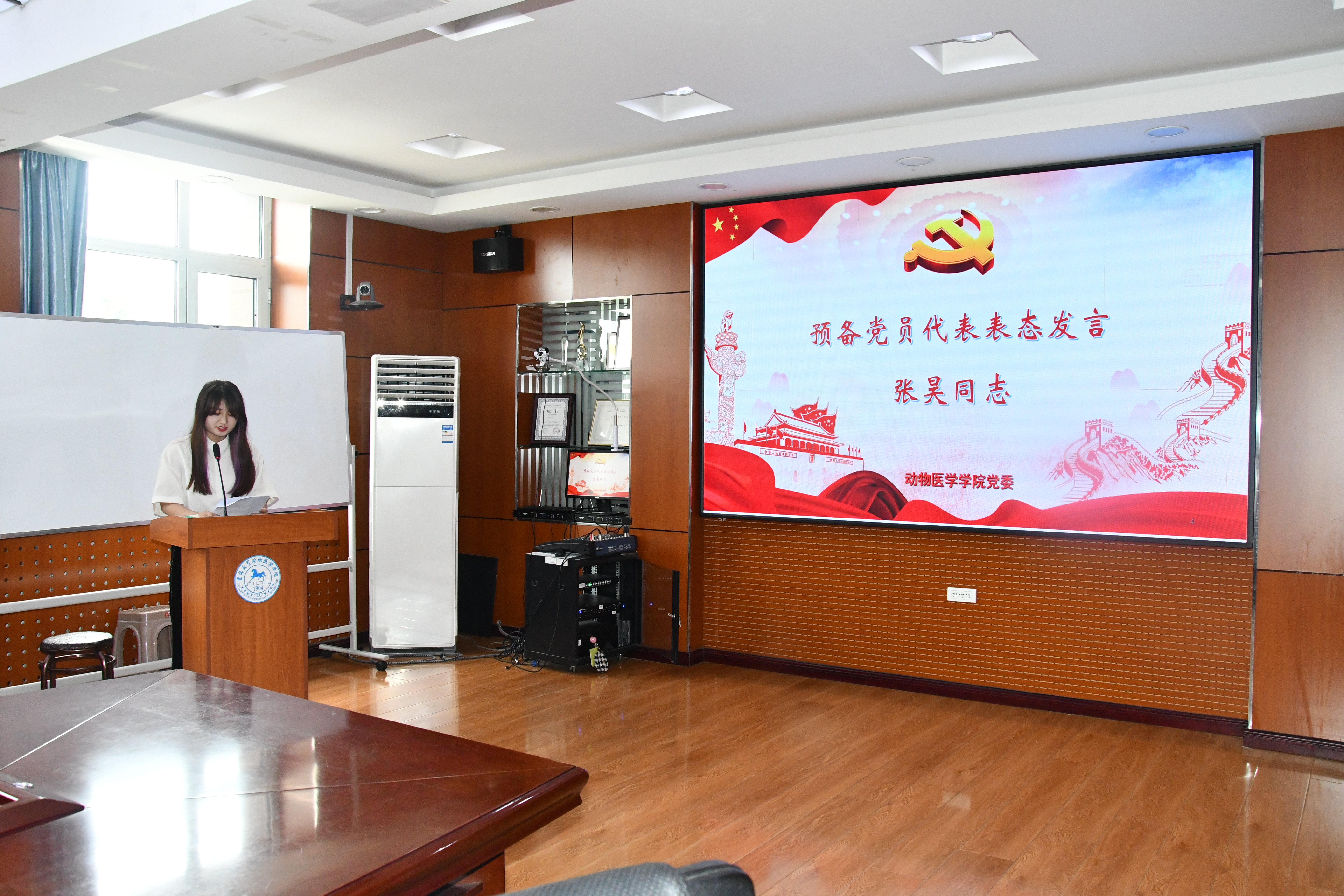 伴随着庄严、雄浑、气势宏大的“国际歌”,宣誓活动正式开始;首先由解胜男同志宣读新发展党员名单。在秦明副书记的领誓下,30名新党员进行了入党宣誓,短短一百多字的誓词是他们入党后对党的第一个承诺。宣誓后,由新党员代表张昊同志发言,她首先向教育、关怀过他们的老师致以衷心的感谢,并对他们自己在以后的学习工作中的表现作出承诺: 要以先进模范为榜样,按照《中国共产党章程》的要求,以党员的标准严格规范自己的言行。最后,秦明副书记在对新党员表示祝贺的同时,也对大家提出希望,希望同学们不要辜负党组织的期望,牢记党的宗旨,发扬党的优良传统,充分发挥党员的先锋模范作用,今后要更加严格要求自己,努力使自己成为一名优秀的共产党员。要立足国家发展,把吉大精神、百年兽医精神作为前进的动力,把个人命运与国家命运紧密相连,将小我融入大我之中,秉承求实创新、励志图强的校训,勤奋学习,锤炼身心,努力做本领过硬、品格高尚的接班人。在这个大有可为的时代大有作为,全力走好新的长征路。