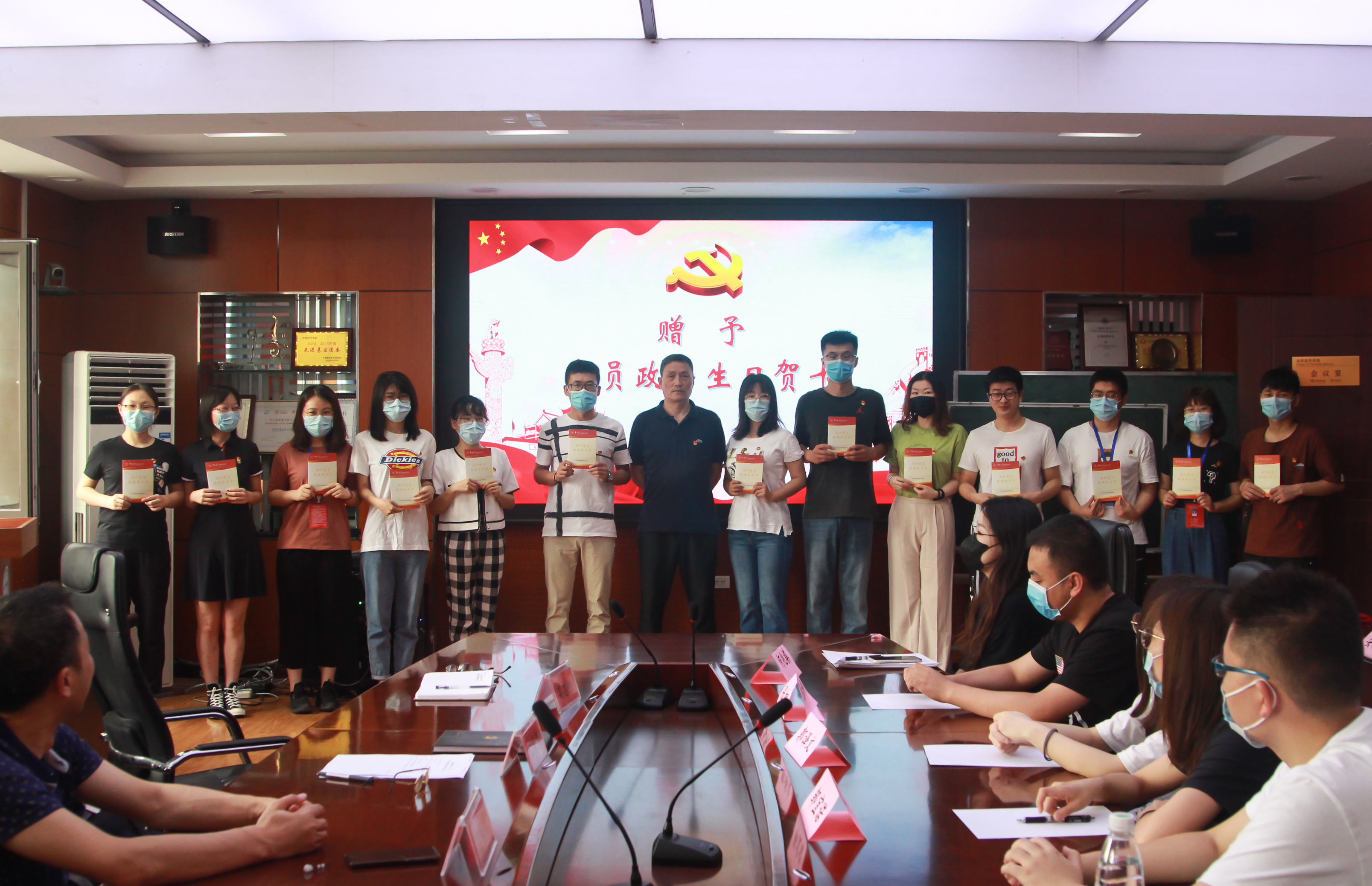 会议在庄严的《国际歌》中拉开序幕。 重温入党誓词“我志愿加入中国共产党…….”毕业生党员语言铿锵有力,声声震耳,现场顿时燃起了信仰的力量。接下来,栾志伟老师、饶家辉老师为毕业生党员颁发党员政治生日贺卡。这是疫情下的一份特殊纪念,也是毕业生党员的一张明信片,期望同学们,不忘初心奉献芳华,砥砺前行不负青春。