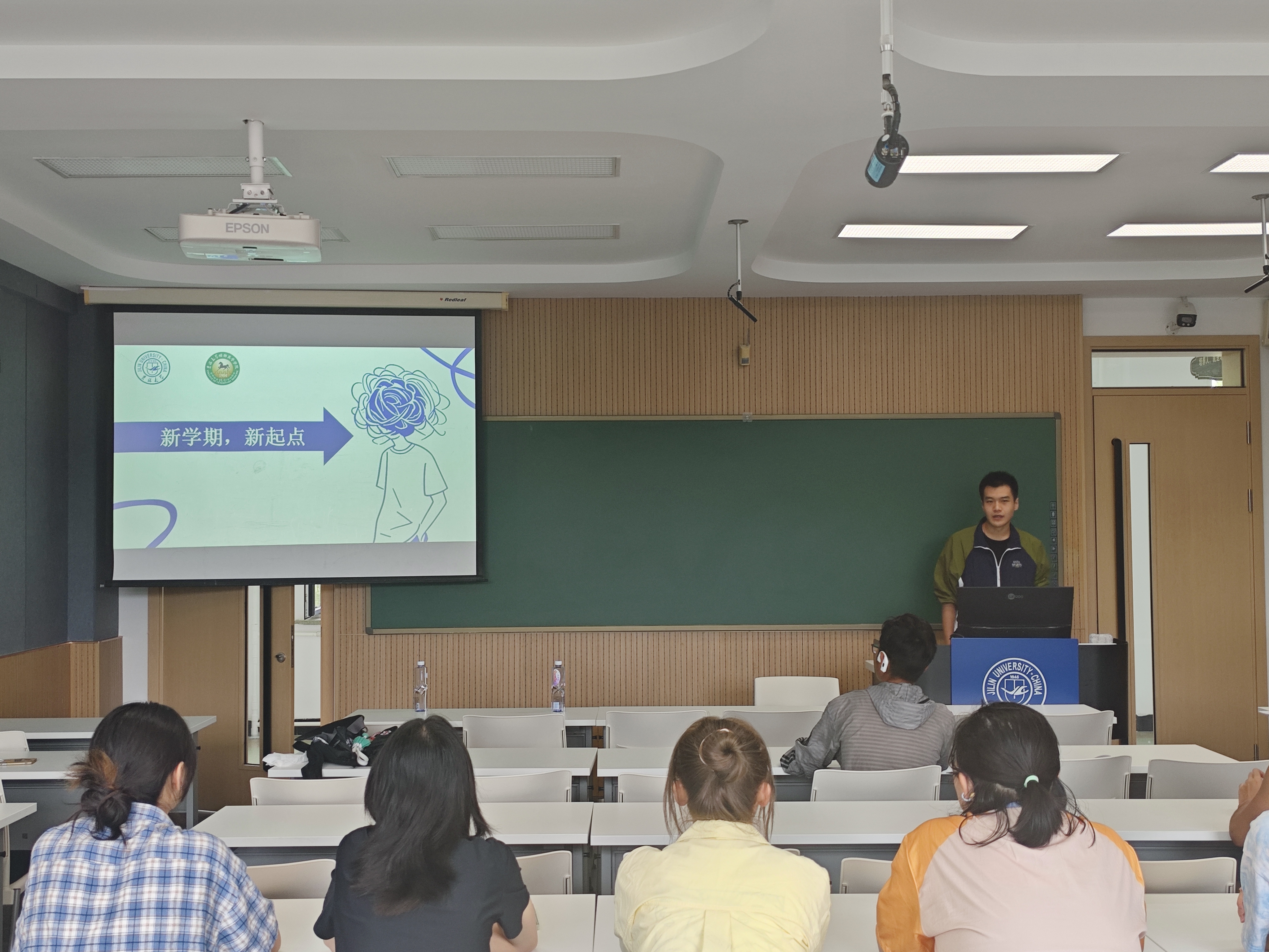 随后,班代苗坤荣学长为同学们做经验分享。他强调了大二学年的重要性,从课程学习、科研训练、班级活动等方面进行了介绍,大二是提升学分绩点的关键时期,之后由于课程的减少,对于绩点的作用变得更加微小。同时,也是打好专业学习基础重要的时期,他希望同学们能够合理安排学习生活,学长的分享让同学们获益匪浅。
