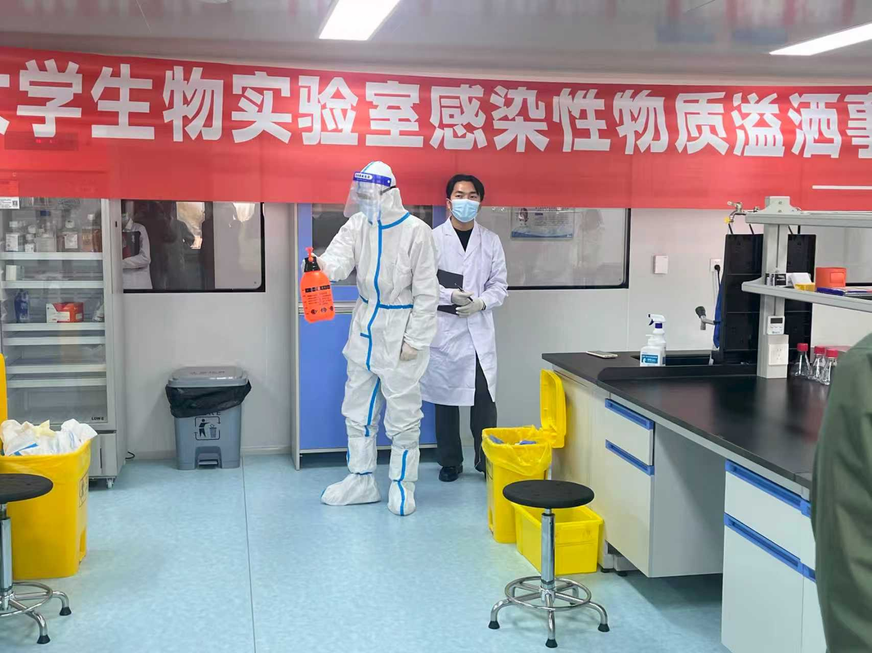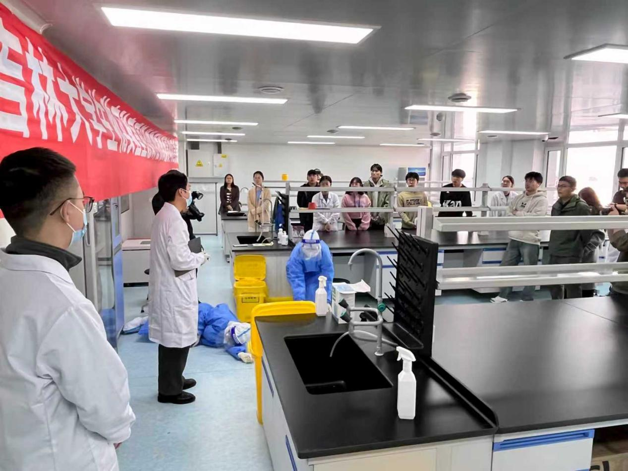 本次演练采用了“模拟情景+实操演练”的方式。企业人员与事先培训好的8名研究生,先后进行了致病性病原体意外泄漏场景模拟,以及事故发生后的应急疏散、现场临时隔离、事故报告、应急处置、应急救助、现场恢复流程进行实操演练。整个应急处置流程响应快速,科学规范,参加演练的同学沉浸式体验了整个操作流程,旁观学习的同学通过认真观察,也详细了解和学习了整个操作流程。