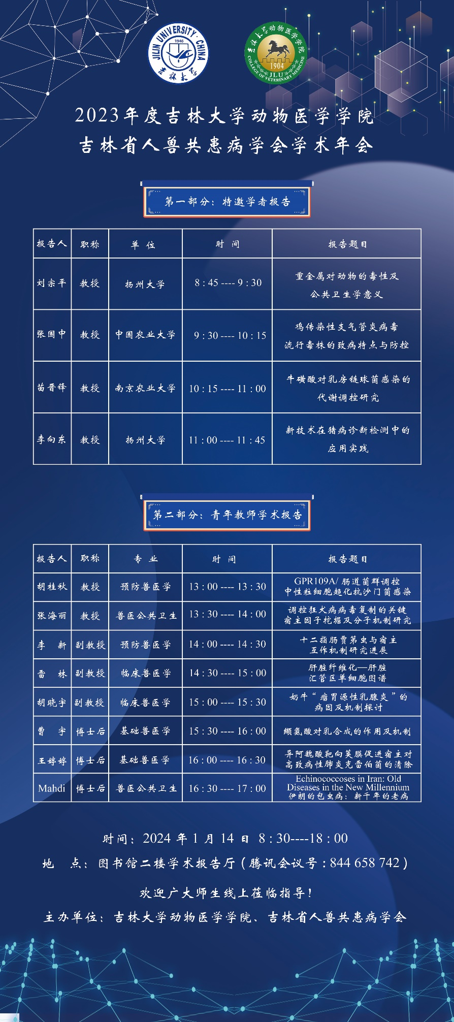 / 2024-01聚焦科研前沿,共话精彩未来。为活跃学术氛围,开拓科研视野,促进学科交叉交流,由蓝鲸体育、人畜共患传染病重症诊治全国重点实验室和吉林省人兽共患病学会共同主办的2023年度学术年会于2024年1月14日在和平校区图书馆二楼学术报告厅举行。来自中国农业大学、南京农业大学、扬州大学、蓝鲸体育等校内外的专家学者汇聚一堂,分享成果,交流经验,为全院师生带来了一场精彩纷呈的学术盛宴,吸引了校内外数百名师生的...